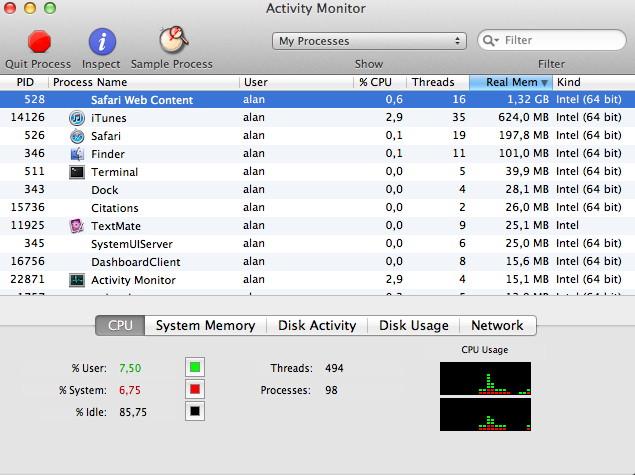 So now I'm finding - really only recently - more and more "gunking up" that doesn't resolve with a restart or PRAM reset even. Once a few browser windows with the tab collection I'm using are back up, all is well for hours or days, and then... freeze city. Here's when I started observing how using Activity monitor can sometimes find a "dead tab" spinning away which I can close and watch RAM get freed up. OK, that's my situation, similar to others I've read.