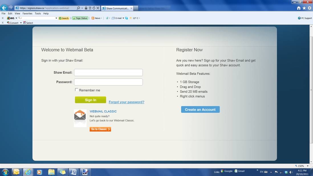 1. Go to the Webmail Beta site and sign in with your Shaw email and password.