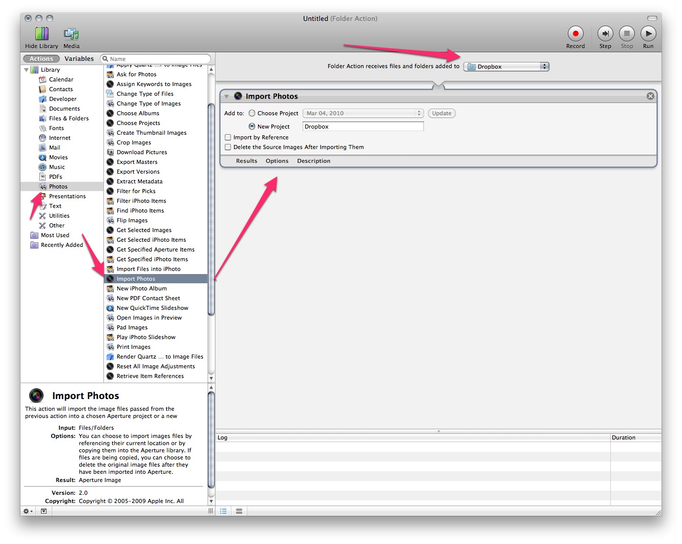Then select the Photos section of the Library and drag out the Aperture Import Photos action. At the top of the window set the Folder Action receives pull-down to the folder you want to monitor. Then in the action set the project you want to import into, either an existing project or a new project. Set the two checkboxes for your workflow and save the action