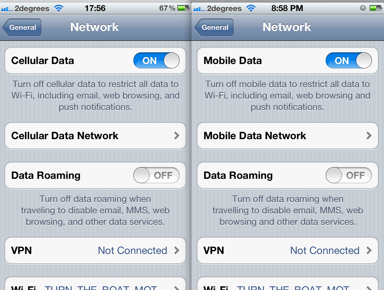 Me and my wife just bought iPhone 4s's for Christmas. They were both bought from the same Apple Store (NZ) and both setup on the same provider (2Degrees in NZ). What I'm wondering about is why our General > Networks menus have differet item names eg