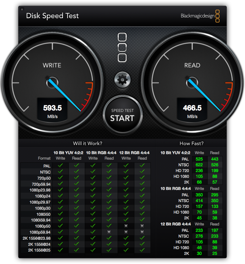 So I filled the thing with 3TB drives, set it up for RAID 6, leaving me with 18TB of useable space and set off to speed testing. I ran the Blackbagic Disk Speed Test and was not met with the amazing results I'd expected.