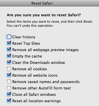 My Reset Safari options are as follows: