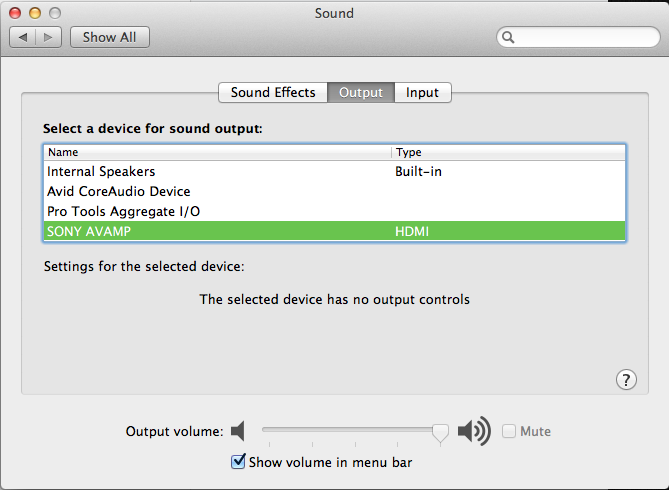 - Go to System Preferences on your Mac. Click on the "Sound" icon. Then in the "Output" tab, select SONYAVAMP - HDMI