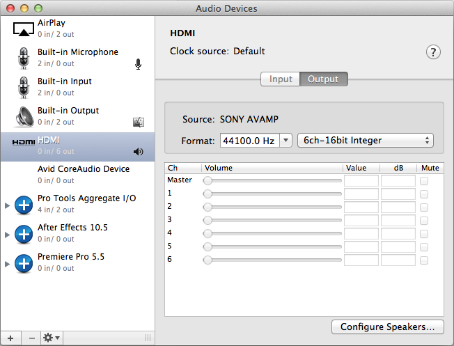 - Then go into Applications > Utilities > Audio MIDI Setup. On the left side of the window select HDMI. On the right side it then should say "Source: SONY AVAMP"