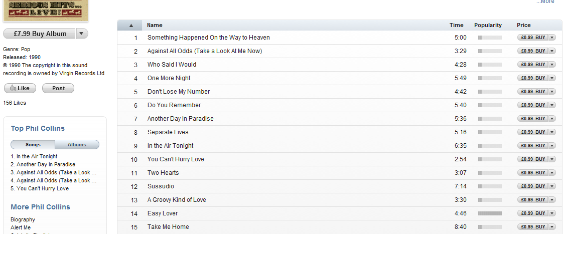 Here in the first album by Phil Collins we can see all tracks are successfully matched. In the second album many are successfully matched but 4 of 15 are uploaded. Looking at the iTunes Store Phil Collins Serious Hits... Live! is shown as a current album.