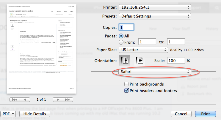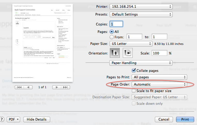My iMac is printing the last page first when printing to a HP OfficeJet Pro 8600 Plus. I am running 10.7. I remember this issue coming up with my old iMac that was running 10.2 but don't remember the fix.