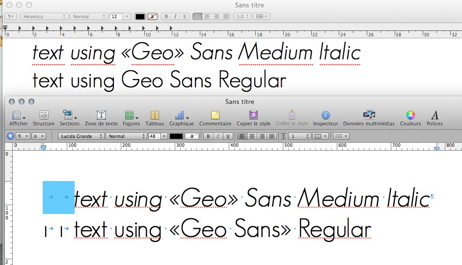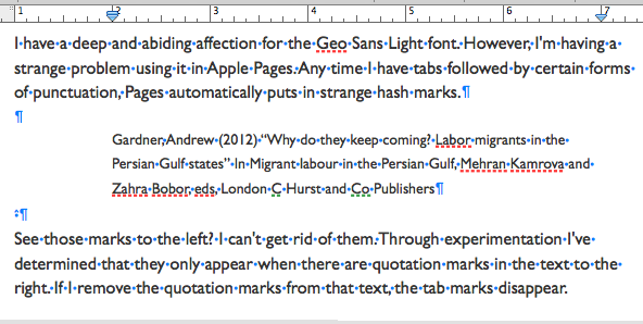I have a deep and abiding affection for the Geo Sans Light font. However, I'm having a strange problem using it in Apple Pages. Any time I have tabs followed by certain forms of punctuation, Pages automatically puts in strange hash marks. It's hard to explain, so I'm going to put a photo clip in here: