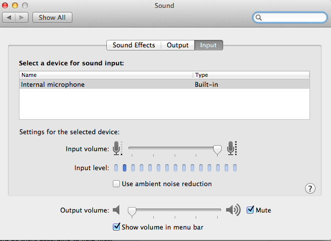 When I plug in the microphone, the output page changes from Internal Speakers to Headphone, the Input page still shows Internal microphone - and it is the internal one that picks up the sound.