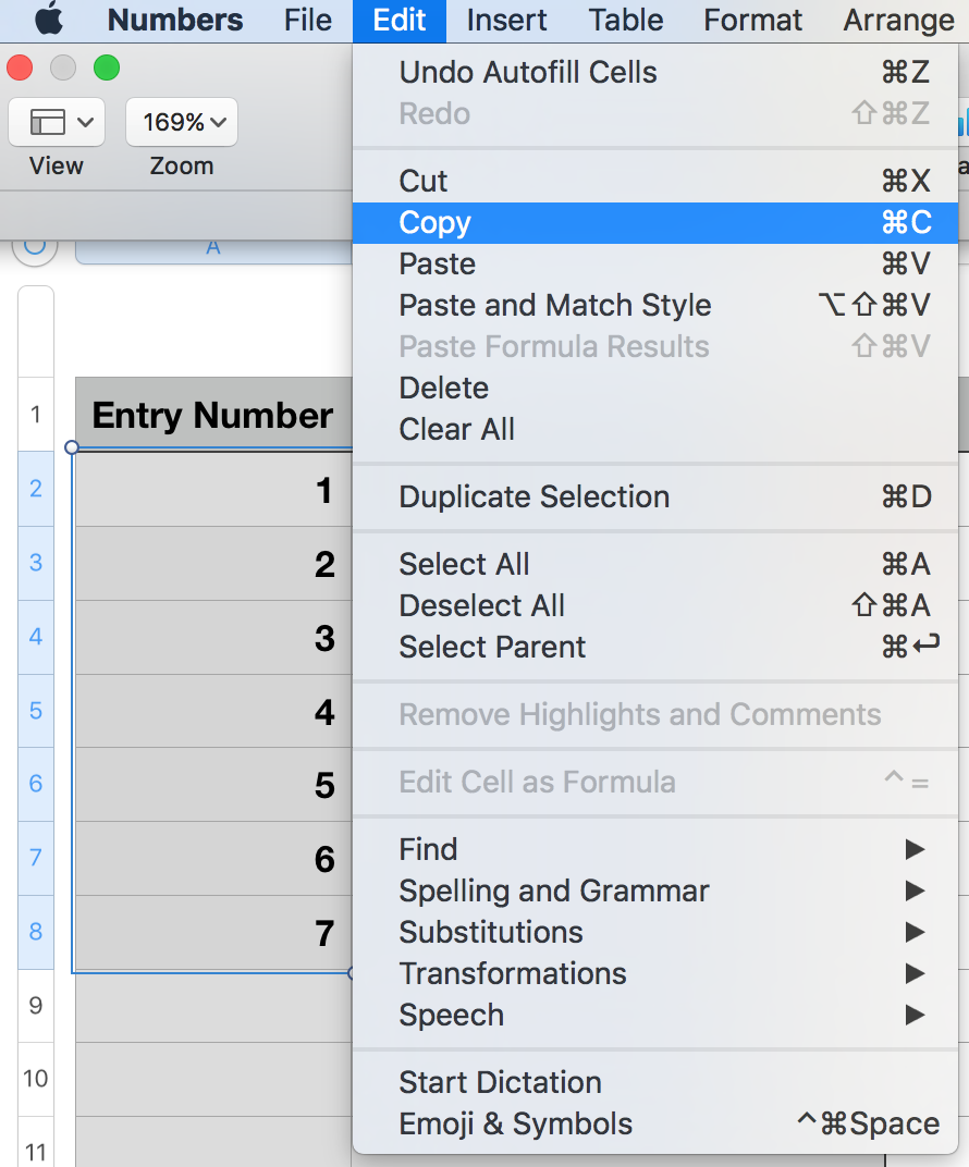 Once you have the list of numbers, and you want make sure you can move the cells around with out disrupting your formula, you need to select and copy the cells.