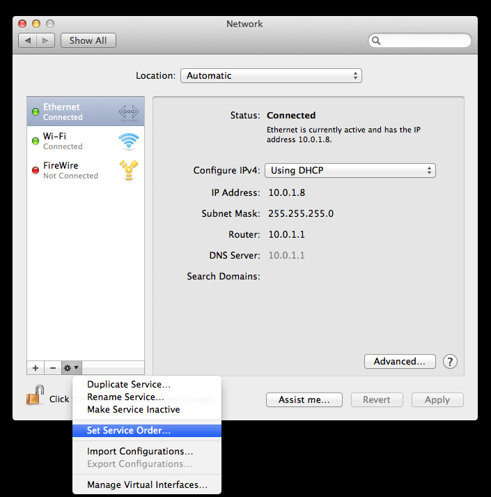 2. Go to System Preferences > Network. Click the lock to authenticate, if necessary. Then click the gear icon under the network interfaces like so:
