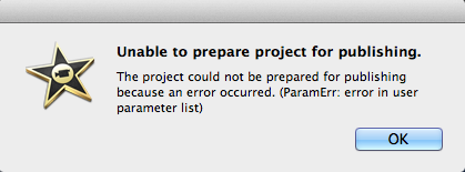 i am trying to export my imovie that i just completed and i am getting a messaage that says unable to prepare project for publishing because of an error. the error in user parameter list. frustrated?