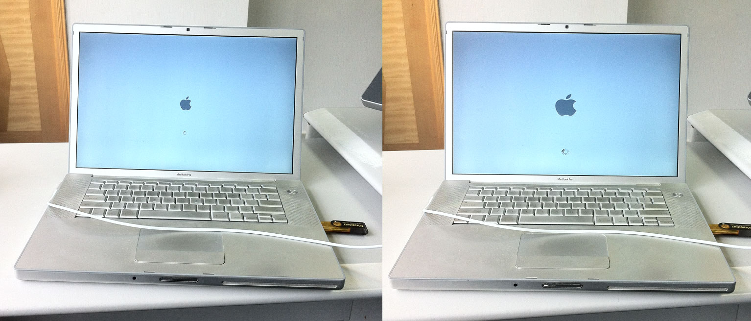 - Apple logo and spinning wheel shows, but are larger than normal (like zoomed in and stretched a little