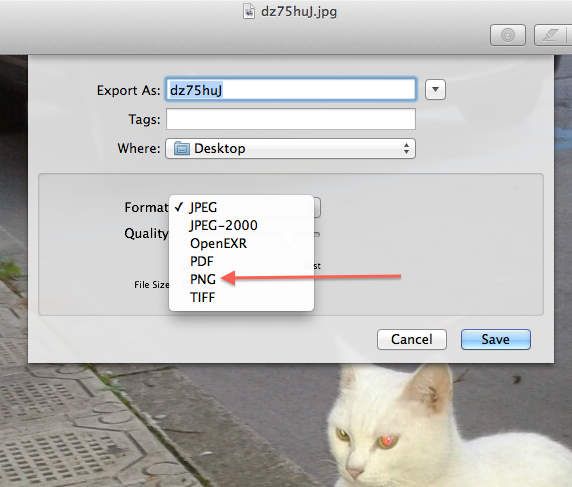 Using Mavericks and viewing a JPEG in Preview, when I choose "Export..." from the File menu I get splash screen; in that screen, if I click the "format" pulldown I get several selections, among which is PNG -