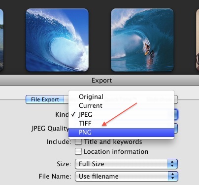 Question? I use EXPORT, but I only get three file format choices: JPG TFF PDF. Someone suggested that I hit the OPTION key to pull up other formats, but that doesn't do anything as far as I can tell. I'm trying to get from a jpg to a png. Any suggestions?