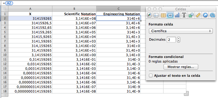 I am taking some electronics courses in college and need to be able to use engineering notation ie: 1E-3, 9E6, etc. How can I best set this up in Numbers '09? All of my entries are automatically being formated as scientific notation (not multiples of 3) and the only other option I can find is just standard numbers. Thank you for your assistance.