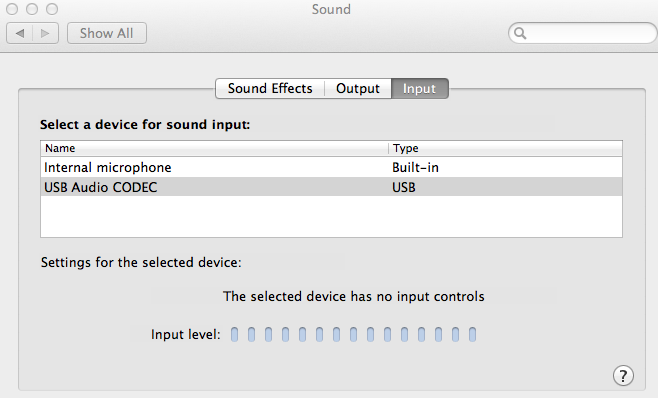 Something similar happens with the Audio MIDI Setup application where in the input section of the USB Audio CODEC all the level controls (Master, 1, 2) are disabled and grayed