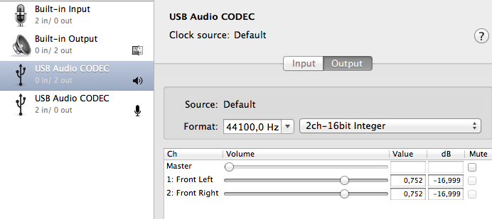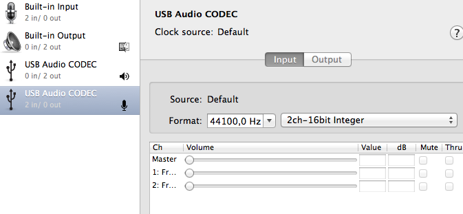 But when I try to use it any of them on my Apple MacBook Pro running Mac OS X Lion (10.7.3) they do not work. I can reproduce sounds coming from my computer to the mixer, but I'm not able to record nothing. I've followed the indications. In the Audio/Midi settings application I select USB Audio Codec as default Input and output device. I did the same on the "System Preferences -> Sounds".