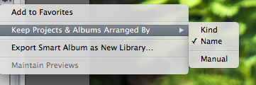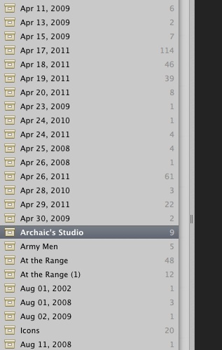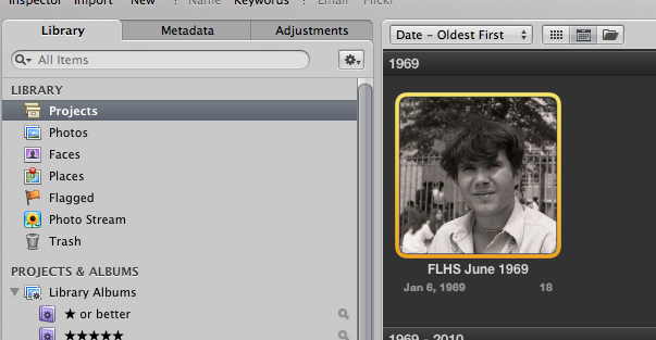 Right now I'm dealing with an iPhoto import so I'm not sure how I've got them set to import. Currently I've got them organized by date, but in the Library sidebar the projects come out organized by name and then date. So, "A" for April leads the pack and included are some projects with names that begin with A that were not shot in April. They are not really chronological at all. So, the projects "Archaic's Studio" has a date of September 11, 2003 while the projects "At The Range" have March 12, 2006 and for "At the Range (1)" has a date of January 1, 2007. Here's a screen shot.