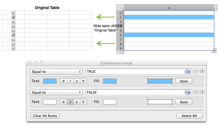The third solution, which does use text colour change to highlight rows where the checkbox has been checked does apply the conditional formatting directly to the cells to be formatted, comparing each to another cell whose content is determined by the state of the checkbox on that row. That solution was writen for a situation where the "the entire text on that line" was in a single cell. Here's an update to include tables where that text may be in more than one cell.