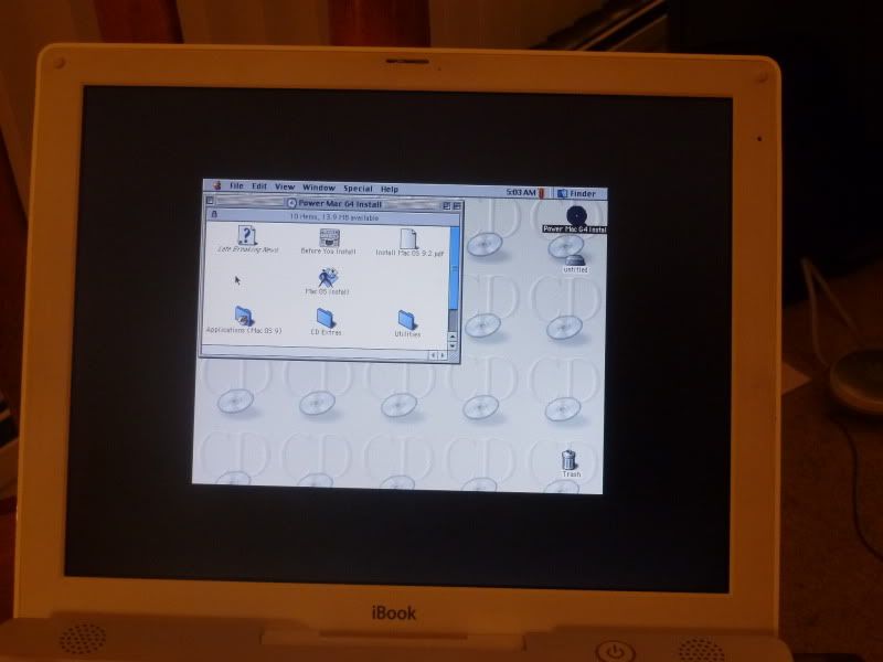 I also tried reinstalling 9.2.2 on it but the CDs both say it cannot run on this machine. I tried both a white disc with the orange 9 on it (9.2.1 software) and a gray Power Mac G4 Mac OS 9.2.2 Install. Formatting the hard drive didn't work either. Are the screens for iBook G3 supposed to be like this? What CD works here?