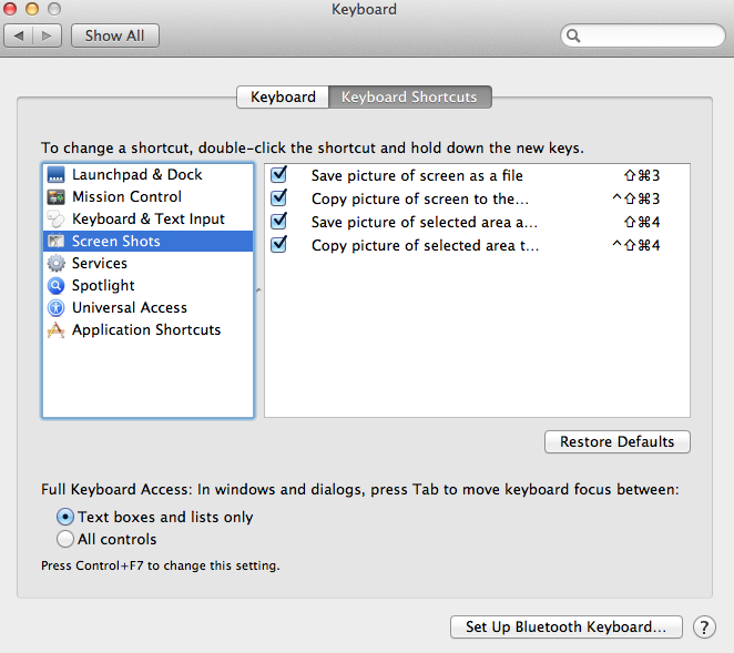 Open Keyboard system preferences, Keyboard Shortcuts. Select Screen Shots in the left panel and make sure the appropriate checkboxes are checked in ther right panel.