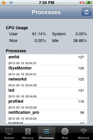 If you are inclined, go to the App Store and download any of the free system monitoring tools that can display CPU usage. Here is the screenshot of my old iPhone 3GS about 5 minutes after upgrading to 5.1. You can see the CPU burning up at over 60%!