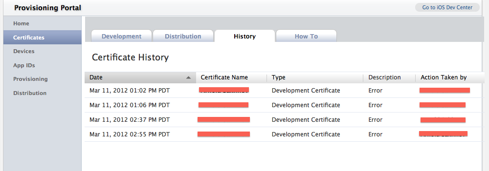 I don’t seem to be able to apply for a development certificate for iOS. Every time I follow the instructions in the iOS provisioning portal and create a certificate request, I see my request receiving status "pending" for a second, but after I reload the page it goes straight to "History" and gets marked as "error" with no further details. I’ve tried to get the certificate directly from Xcode, but to no avail either.