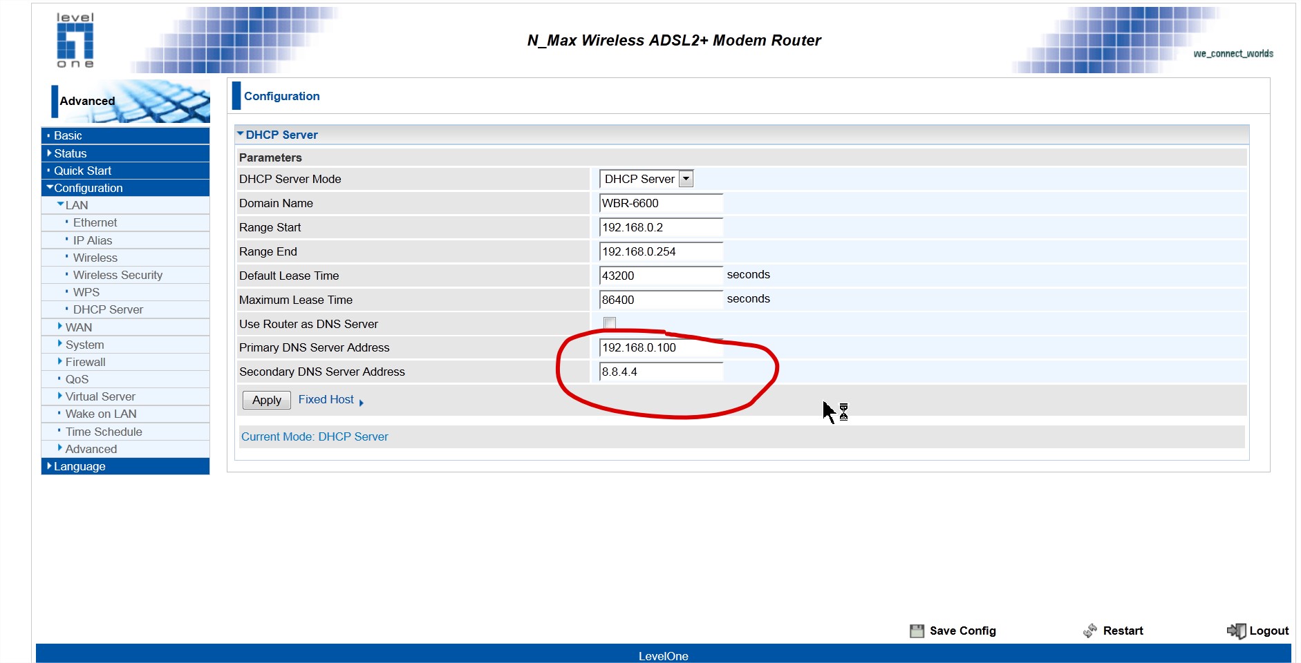 My router uses google dns on WAN profile page, and on "DHCP Server" profile page I use my mac-mini's IP as Primary DNS Server Address and Google's 8.8.4.4 as "Secondary DNS Server Address"