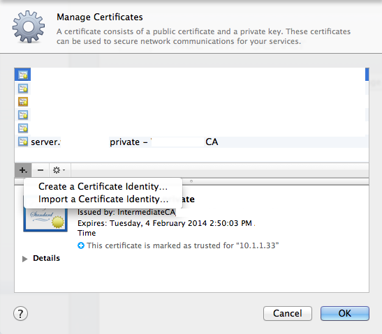 In the sub-window that pops up you see a list of already present certificates, including the root CA certificate that you created in step 1. Ignore this list for now. Click the "gear" icon right to the question mark in lower left hand corner.