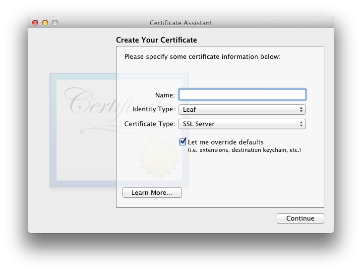 Now the "Certificate Assistant" opens and you have to make your first choices.