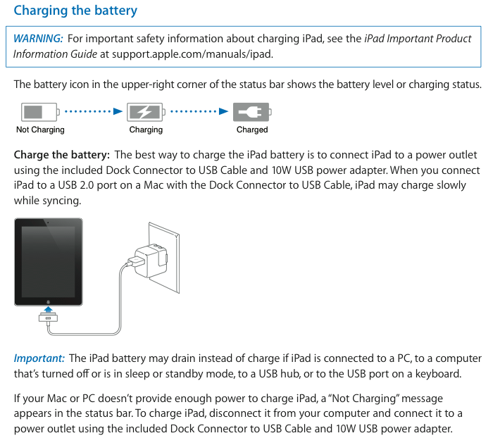 The quickest way (and really the only way) to charge your iPad is with the included 10W USB Power Adapter. iPad will also charge, although more slowly, when attached to a computer with a high-power USB port (many recent Mac computers) or with an iPhone Power Adapter. When attached to a computer via a standard USB port (most PCs or older Mac computers) iPad will charge very slowly (but iPad indicates not charging). Make sure your computer is on while charging iPad via USB. If iPad is connected to a computer that’s turned off or is in sleep or standby mode, the iPad battery will continue to drain.