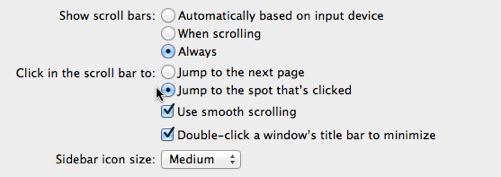 In my case, my scrollbars in iTunes are refusing to do either of the options. It won't "Jump to the spot that's clicked" OR "jump to the next page" for me! When I click somewhere on the scrollbar like I would to jump to that spot, nothing happens. iTunes basically ignores me. The only way I can scroll (besides mouse wheel and trackpad) is to click and drag the bar itself.