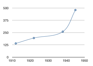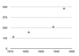 What it seems to produce in such cases is a ranked sequence--by point 1, point 2, point 3, etc. with equal spacing. In other words, it can do a line chart, with even spacing between the x-axis years... which, of course, isn't what one has in that data! The x-axis points should differ by 10 years, then 16, and then 7.