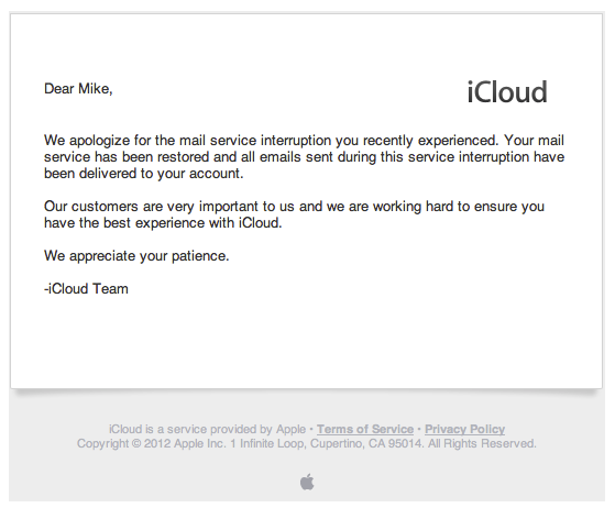 Apple has sent an emailed apology to customers affected by the recent iCloud outage that took down email for a small fraction of users for several days. Apple claimed the outage only affected 1.1% of iCloud users.