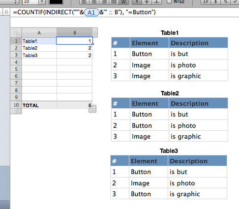 =COUNTIF(Table 1:Table 2 :: B, "=Button") (shows 0)