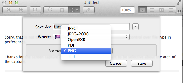 If APPLE is listening ... PLEASE --> simply add the file format choice to Grab's Saving option, or make it a Prefenece choice <-- PLEASE. Thanks!!