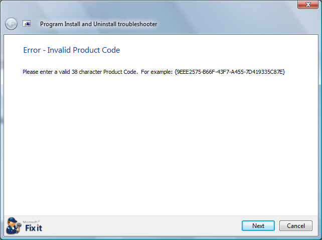 The name of that folder is the "Product code" that the Windows Fixit is asking for.