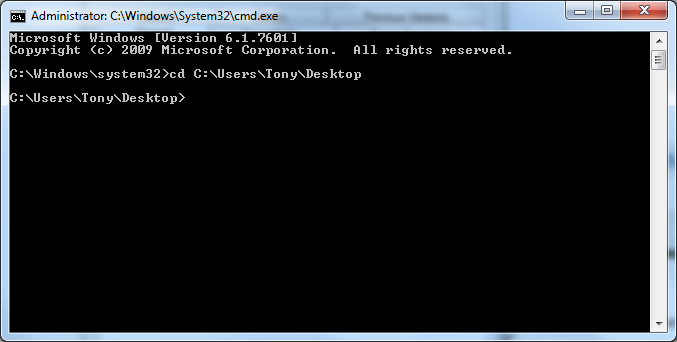 At the command prompt that comes up, type CD and then a space. Right-click after the space and select "Paste". Hit enter. The command prompt screen should now look a bit like the following screenshot