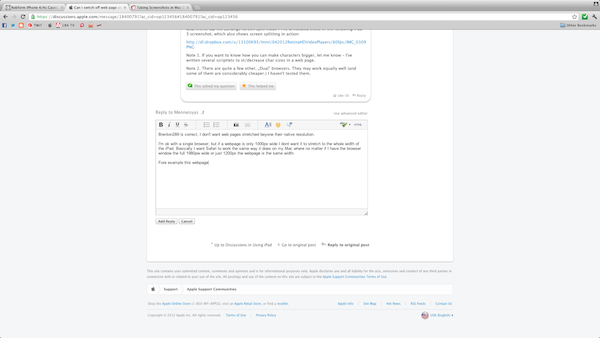 Finally, the example above is using 1536 pixels as the webpage width. This corresponds to the iPad 3's horizontal resolution while in portrait mode. You can easily adjust this by changing the number in the beginning right after where it says "javascript:var%20w=". The resolution on the iPad 3 is so freaking good, you can go as high as 3072 and still barely make out text, hehe. But anyways, you may decide 1536 is too small to read, in which case, i'd suggest 1280. It's near half way between the default size of 980 (see below) and 1536. I find myself using this more often than 1536 to be honest.