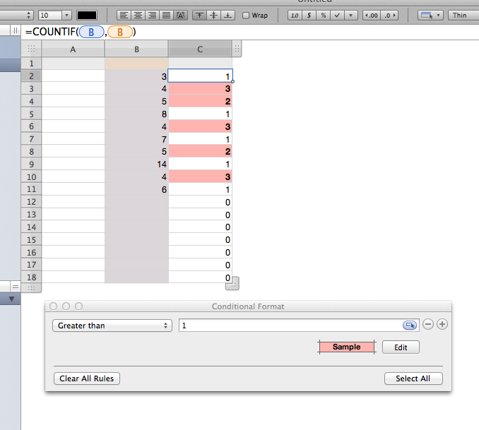 Type =COUNTIF(B,B) in the new column, just opposite the first data in column B