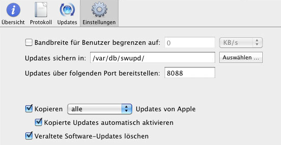 5. Once the reboot has taken place, use ServerAdmin to re-configure and start the Software Update Service. Allow the server time to re-download the software updates (this could take anywhere from 3-30 hours depending on connection speed of the server). Wait until it is finished (watch the log!)