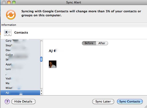 Also, which program is actually creating the Sync Alert message? Is it Apple Address Book, Apple iSync or Google Contacts?