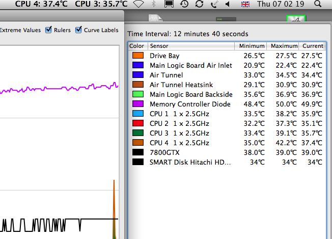 When using FCP7 (30min film export to Compressor) the highest the Temp reads is 71c / 52c / 52c/ 62c for each core - and fans are at 70% power, have never got to flat out stage.