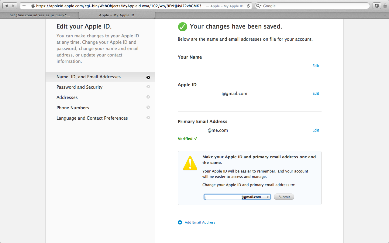 Opened the Mac, no email! My primary adress is the @me.com one (i use it the most) but in my account i see the Apple ID as a Gmail one. I don't want to use Gmail anymore. Today i checked the Gmail, and the FInd My iPhone mail was there! What can i do so that it'll send mails on the @me.com instead of Gmail?