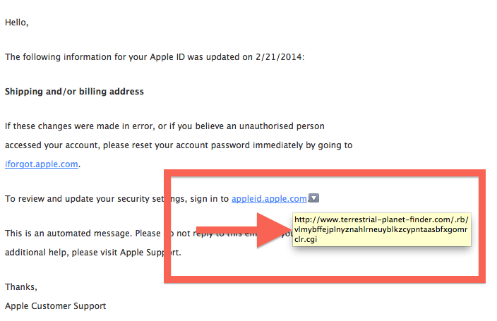 Thanks Erugina. Positioning your cursor over the link in the email reveals what site will load if you were to click it: