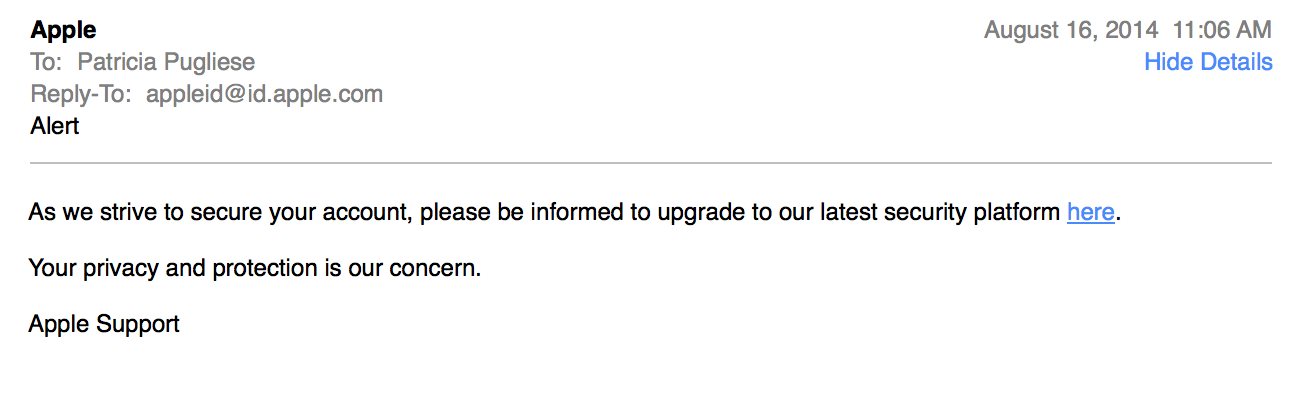 One thing that alerted me to the idea that this wasn't legit is the lack of Apple's usual logo, the typeset seemed different that I'm used to seeing on Apple alerts, there was no change in shading on the email (similar to what you see on this web page) and the fact that it only said Alert in the subject line.