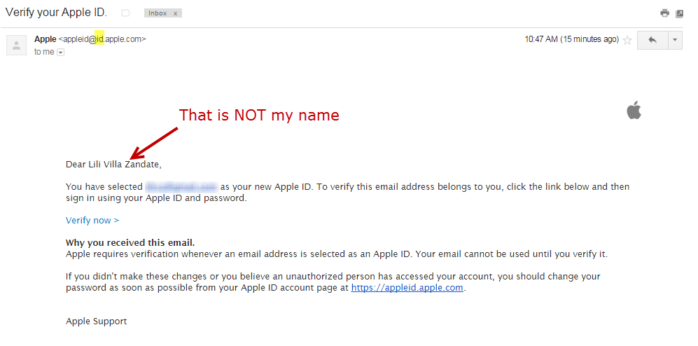 Thanks, this was so helpful. Warning bells started going off that this was a scam when I received this email because, first of all, Lili Villa Zandate is NOT my name and no where close to being my name, although I can see how it could have been randomised or derived from my email address - and now that I came across this thread, I can see the email its from is so close to the actual apple server, apart from the fact that it has an extra "id." in front of the apple.com (See below highlighted in yellow)