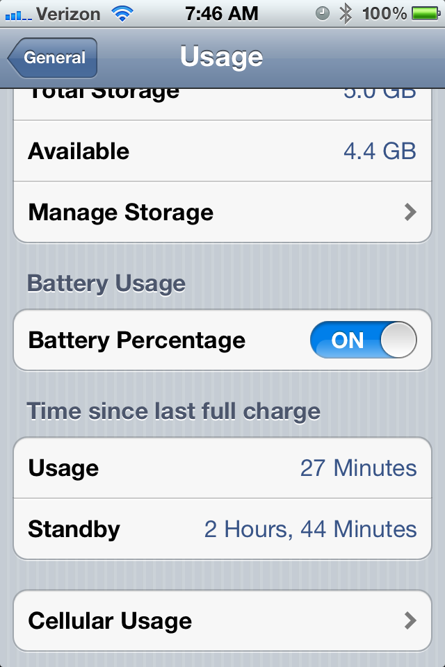 Tomorrow, if I remember, I will reset my settings to do a screen cap of my battery life issues, since its obvious that because Im new to the forum, I must be lying about the battery drain or it's "all in my head". I had decent battery life before iOS 5. I could use my phone most of the day for various task and end the business day with about 75% of my battery. After I updated to iOS 5.0, I had the dreaded battery drain issue (and did so even after I updated to 5.0.1), where the end of my day resulted in around 40% battery. I patiently waited for 5.1. 5.1 did seem to slow the battery drain down, where at the end of my day I was 50-60% battery.