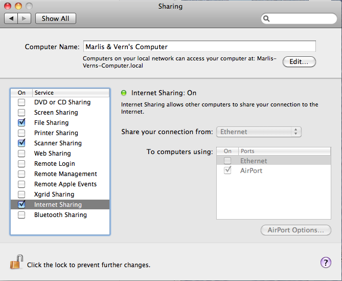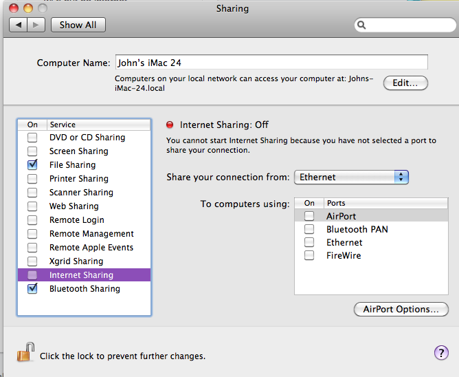 To configure Internet Sharing, first stop it (by clicking once on its check box).