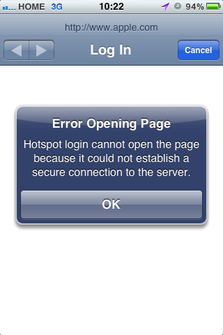 I am trying to connect to a public wifi network. My iPad connects marvoulesly. My iPhone not so much. I have an iPhone 4 and everytime I go to connect, it goes to a pop up page where I'm supposed to click a link to adhere to their TOS. When I get the pop up page I get "Hotspot login cannot open the page because it could not establish a secure connection to the server"